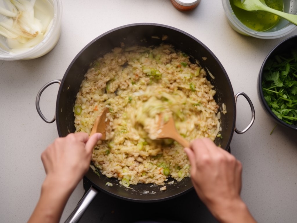 Using cold broth straight from fridge shocks the rice, causing uneven cooking and crunchiness. Fix: Warm broth in microwave first, then add boiling for faster absorption and fluffier results.